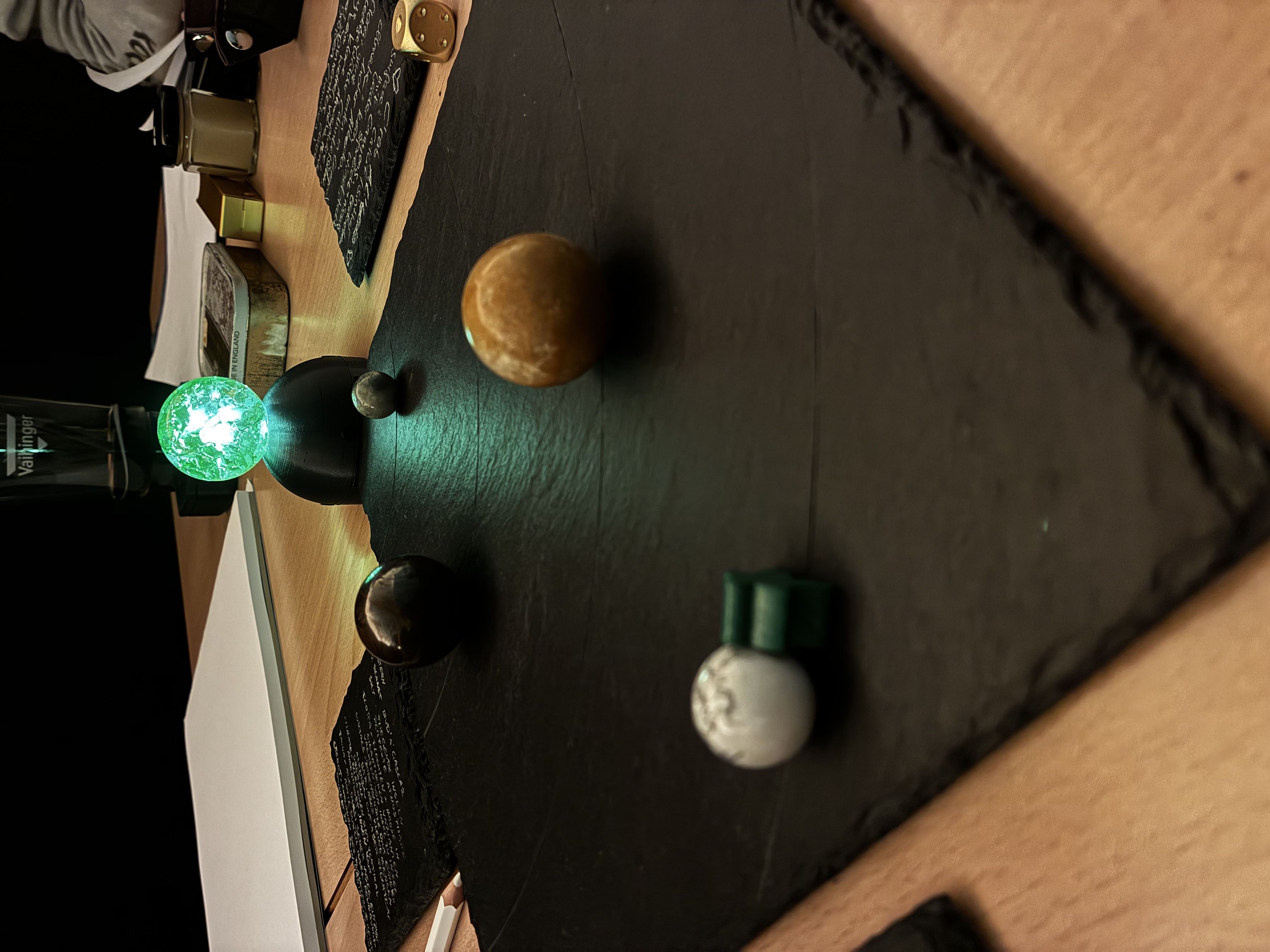 It would be remiss of me not to mention that we didn't play the official version of the game—which is beautiful, and will get a greatly enhanced physical version very soon—but an absolutely incredible version entirely homebrewed by one of my fellow players. So while we used the official rules, our rocks were these perfect, planet-like spheres of different sizes, placed on a board of slate with milled orbit lines, and an actual glowing sun.